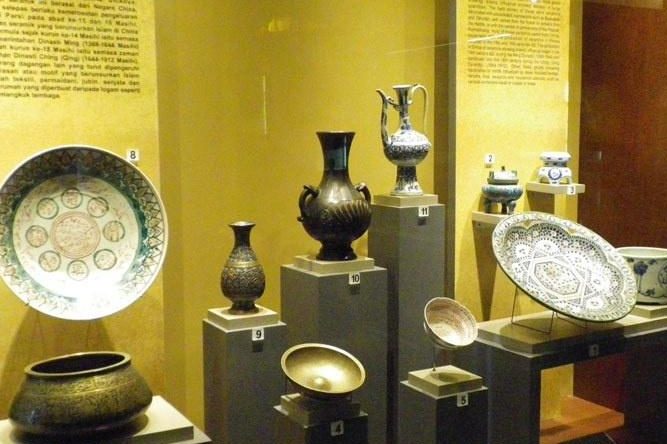 The museum currently has a collection of over 7000 cultural relics and artworks, divided into 2 floors and 12 exhibition halls for permanent display, and 2 additional exhibition halls for temporary display. Five exhibition halls on the first floor are themed around architecture, the Quran and manuscripts, India, China, and Malaysia; The 7 exhibition halls on the 2nd floor are themed around textiles, jewelry, weapons, coins and seals, metal objects, wood carvings, and ceramics.